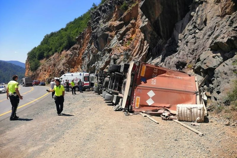 Trabzon’dan Gümüşhane istikametine giden tır Zigana dağındaki virajda yan yattı. Kazada tırın altında sıkışan sürücü yaralandı.