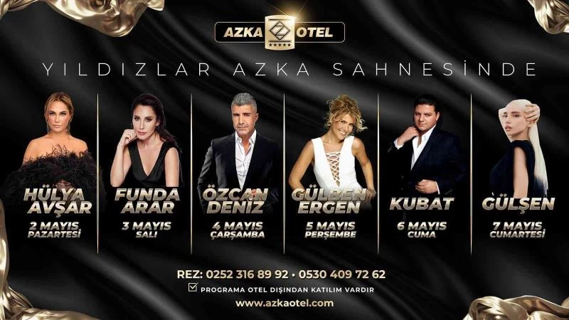 Bodrum’da Ramazan Bayramı’nda kentin en lüks otellerinden biri olan Azka Otel’de unutulmaz konserler verilecek. 2 Mayıs’ta Hülya Avşar’la başlayacak olan bayram konserleri, 3 Mayıs’ta Funda Arar, 4 Mayıs’ta Özcan Deniz, 5 Mayıs’ta Gülben Ergen, 6 Mayıs’ta Kubat ve 7 Mayıs’ta ise son zamanlarda sahne şovlarıyla gündeme gelen ve adından çokça kez söz ettiren Gülşen sahne alacak. Bayramın festival havasında gececiği otelde, otel müşterilerinin yanı sıra dışarıdan da misafirler ağırlanacak. Otelin birbirinden lezzetli yemeklerini yiyecek olan yerli ve yabancı turistler konserler ile unutulmaz bir bayram yaşayacak.