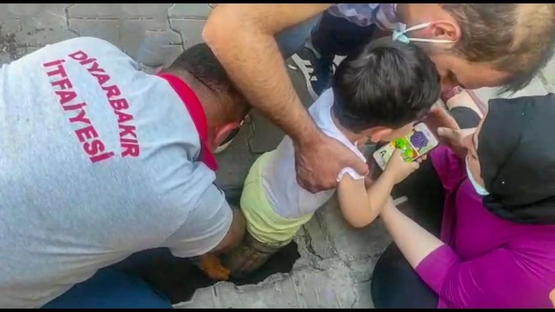Diyarbakır Büyükşehir Belediyesine bağlı itfaiye ekipleri, oyun oynarken bacağı sitenin su tahliye borusuna sıkışan 2 yaşındaki Miran’ı zarar görmeden kurtardı.