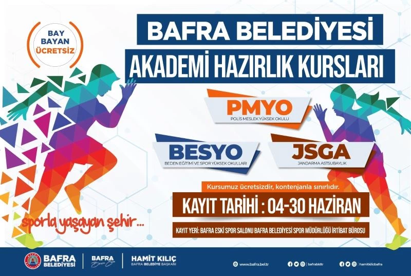 Bafra Belediyesi; Beden Eğitimi Spor Yüksek Okulu (BESYO), Polis Meslek Yüksek Okulu (PMYO) ve Jandarma Astsubaylık (JSGA) sınavlarına yönelik Akademi Hazırlık Kurslarının kayıt tarihi 30 Haziran’da sona eriyor. Spor Müdürlüğü bünyesindeki uzman eğitmenler nezaretinde verilecek ikinci Akademi Hazırlık Kurslarının kayıtları eski Kapalı Spor Salonu’nda yer alan irtibat bürosuna yapılacak.