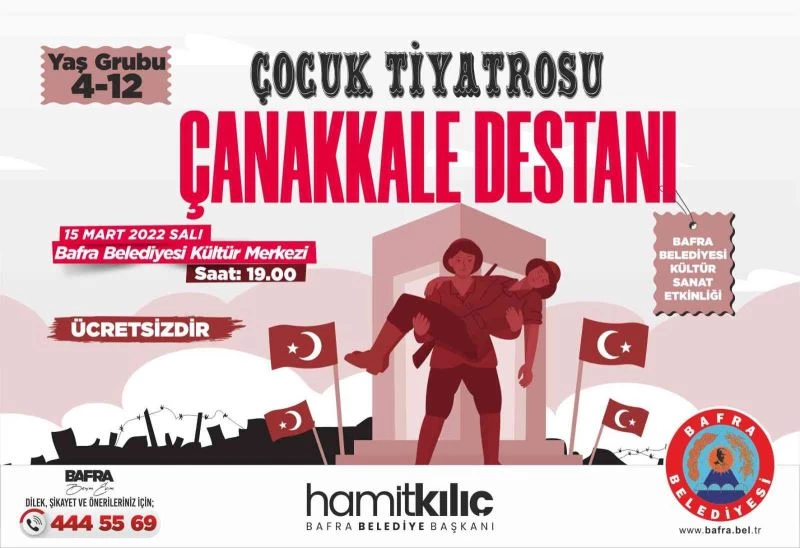 Yarıyıl tatilinde karne hediyesi olarak çocuklara tiyatro heyecanını yaşatan Bafra Belediyesi oldukça yoğun ilgiyle karşılaşan oyunun ardından 18 Mart Çanakkale Zaferi ve Şehitleri Anma Günü etkinlikleri kapsamında da yine bir gösteriyle çocukları buluşturuyor.