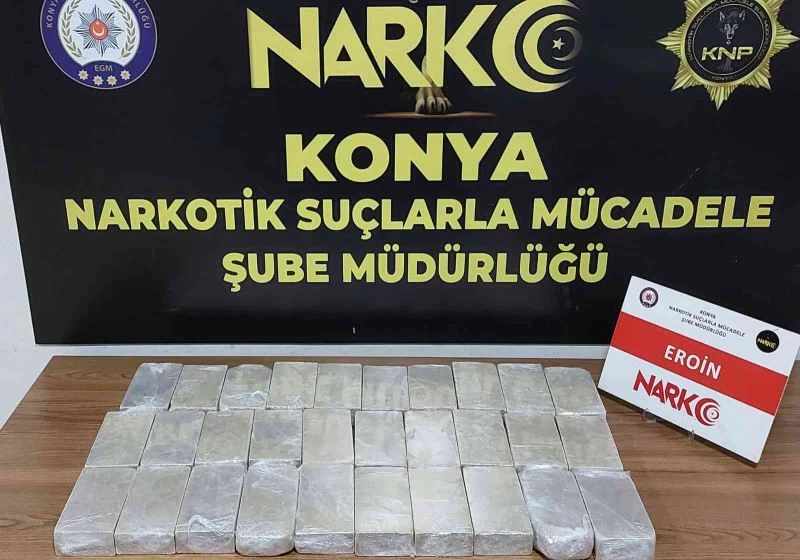 Edinilen bilgiye göre, Konya İl Emniyet Müdürlüğü Narkotik Suçlarla Mücadele Şube Müdürlüğünce kente giriş ve çıkış noktalarında yapılan çalışmalar çerçevesinde şüphe üzerine durdurulan bir araçta hassas burunlu narkotik köpeği Felix ile arama yapıldı. Aramada aracın bagajındaki eşya ve makarna paketlerinin altına gizlenmiş 30 parça halinde 15 kilo 90 gram eroin maddesi ele geçirilirken, uyuşturucu madde ticareti yapmak/nakletmek ve kullanmak suçlarından 2 kişi gözaltına alındı. Emniyetteki işlemleri tamamlanan 2 şüpheli adliyeye sevk edildi. Şüpheliler çıkarıldıkları mahkemece tutuklanarak cezaevine gönderildi.