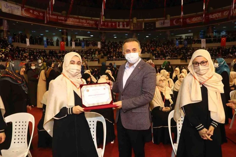 Bağcılar’da hafızlık kursunu başarıyla tamamlayan 111 kız hafız, Olimpik Spor Salonu’nda düzenlenen coşkulu bir törenle hem icazet belgelerini aldı hem de taçlarını taktı. Programa katılan TBMM Başkanı Mustafa Şentop’un annesi ve eşi de hafizeleri tebrik etti.