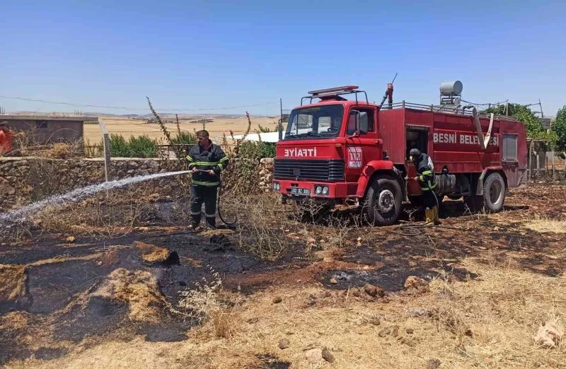 Olay, Besni’ye bağlı Kesecik köyünde meydana geldi. Arif Erdem’e ait bahçede saman balyalarında yangın çıktı. Yangını gören köy sakinleri durumu Besni Belediyesi itfaiye ekiplerine bildirdi. Kısa sürede olay yerine gelen itfaiye ekipleri yangına müdahale ederken, ahıra sıçrayan yangında inek yanarak yaralandı.