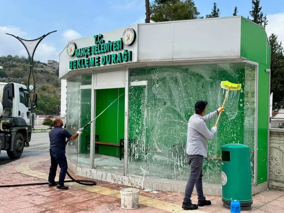 Osmaniye'nin Bahçe İlçesi'nde pislikten kokan otobüs durakları tertemiz yapılıyor.