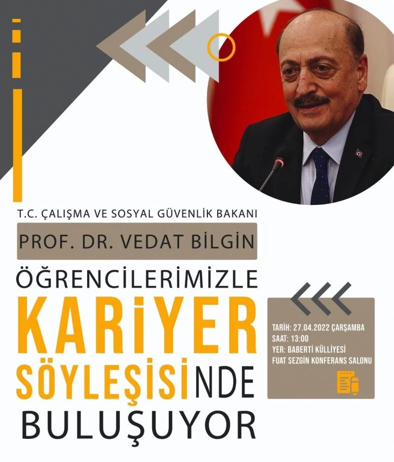 Çalışma ve Sosyal Güvenlik Bakanı Prof. Dr. Vedat Bilgin, Bayburt Üniversitesi tarafından düzenlenecek olan Kariyer Söyleşisinde öğrencilerle bir araya gelecek.