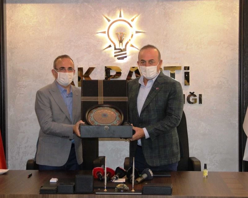AK Parti İzmir İl Başkanı Kerem Ali Sürekli de ziyaretinden dolayı Bakan Çavuşoğlu’na teşekkür ederek hediye takdiminde bulundu.
