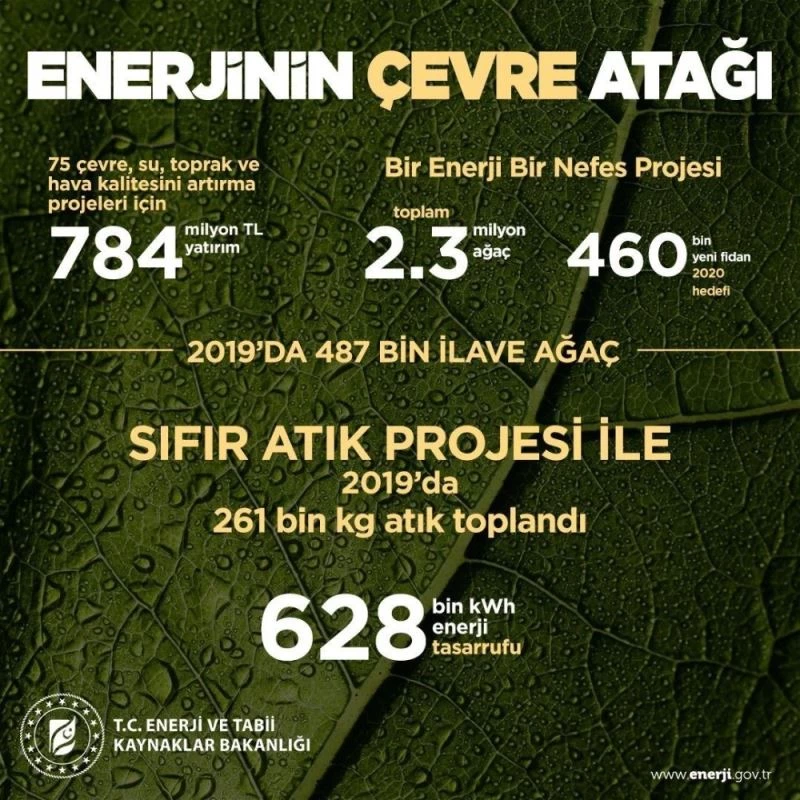 "Enerji’nin Çevre Atığı" başlığı altında bilgiler veren Bakan Dönmez, 75 çevre, su, toprak ve hava kalitesini artırmak için yaptıkları projeler için 784 milyon lira yatırım yaptıklarını ve "Bir Enerji Bir Nefes Projesi" kapsamında ise 2020 hedefinde toplam da 2.3 milyon ağaç ile 460 bin yeni fidan diktiklerini belirtti.
