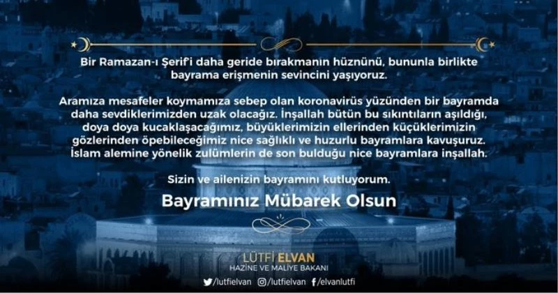 Hazine ve Maliye Bakanı Lütfi Elvan, İslam alemine yönelik zulümlerin son bulduğu bayramlara kavuşmayı dileyerek, vatandaşların Ramazan Bayramı’nı kutladı.