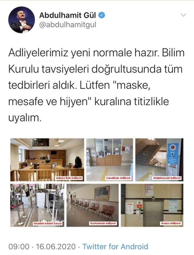 Adalet Bakanı Abdulhamit Gül, “Adliyelerimiz yeni normale hazır. Bilim Kurulu tavsiyeleri doğrultusunda tüm tedbirleri aldık. Lütfen ‘maske, mesafe ve hijyen’ kuralına titizlikle uyalım” dedi.