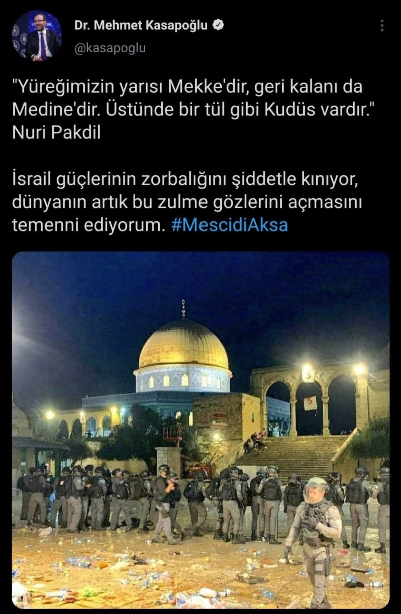 Gençlik ve Spor Bakanı Kasapoğlu, Mescid’i Aksa’da Filistinlilere yapılan saldırıyı şiddetle kınadığını bildirdi. Bakan Kasapoğlu, sosyal medya hesabından konuya ilişkin yaptığı paylaşımda, “Yüreğimizin yarısı Mekke’dir, geri kalanı da Medine’dir. Üstünde bir tül gibi Kudüs vardır.” ’Nuri Pakdil.’ İsrail güçlerinin zorbalığını şiddetle kınıyor, dünyanın artık bu zulme gözlerini açmasını temenni ediyorum” ifadelerine yer verdi.