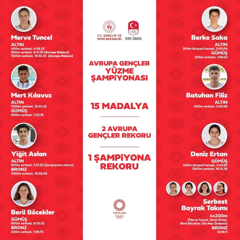 "İtalya’nın başkenti Roma’da düzenlenen Avrupa Gençler Yüzme Şampiyonası’nda, 7 altın, 5 gümüş ve 3 bronz olmak üzere, toplamda 15 madalya kazanarak ve 3 Avrupa rekoru kırarak takım halinde ikinci olan millilerimizi yürekten tebrik ediyorum. Bu organizasyonun son 10 yılında toplam 12 madalya toplamış olduğumuz düşünülürse, Ay yıldızlı başarılı sporcularımızın kazandığı madalyaların ışıltısının, Türk sporunun geleceğini aydınlatan birer güneş niteliğinde olduğu anlaşılacaktır. Yapılan yatırımların, verilen emeklerin ve tüm çalışmaların karşılığında aldığımız bu haberlerin yaşattığı gurur, göğsümüzü kabartmak ile beraber bizleri duygulandırmaktadır. Milli Takımımızın bu başarısında, evlatlarımızın geleceğe dair umut veren bu yükselişinde emeği geçen herkese gönülden teşekkürlerimi sunuyorum."