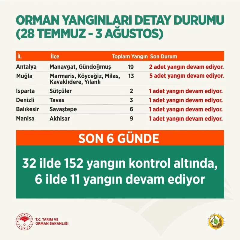Tarım ve Orman Bakanı Pakdemirli, 28 Temmuz - 3 Ağustos 2021 tarihli orman yangınları detay durumu listesini açıkladı. Bakan Pakdemirli, çıkan yangınlardan 152 orman yangının kontrol altına alındığını, 11 yangının kontrol altına alma çalışmalarının devam ettiğini duyurdu. Antalya’da 19 yangından 2’si, Muğla’da 13 yangından 5’i, Isparta’da 2 yangından 1’i, Denizli 3 yangından 1’i, Balıkesir’de 6 yangından 1’i, Manisa 9 yangından 1’i devam ediyor.