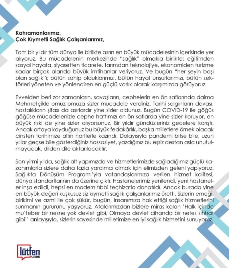 “Evvelden beri zor zamanların, savaşların, cephelerin en ön saflarında daima Mehmetçikle omuz omuza sizler mücadele verdiniz. Tarihi salgınların devası, hastalıkların şifası da asırlardır yine sizler oldunuz. Bugün Covid-19 ile göğüs göğüse mücadelenizle cephe hattımızı en ön saflarda yine sizler koruyor, en büyük riski de yine sizler alıyorsunuz. Bir yıldır gündüzleriniz gecelere karıştı. Ancak ortaya koyduğunuz bu büyük fedakarlık, başka milletlere örnek olacak cinsten tarihimize altın harflerle kazındı. Dolayısıyla pandemi bitse bile, uzun yıllar geçse bile gösterdiğiniz hassasiyet, yazdığınız bu eşsiz destan asla unutulmayacak, dilden dile aktarılacaktır. Son 20 yılda sağlık alt yapımızda ve hizmetlerimizde sağladığımız güçlü kazanımlarla sizlere daha fazla yardımcı olmak için elimizden geleni yapıyoruz. Sağlıkta Dönüşüm Programı’yla vatandaşlarımıza verilen hizmet kalitesi, dünya standartlarının da üzerine çıktı. Hastanelerimiz yenilendi, yeni hastaneler inşa edildi, hepsi en modern tıbbi teçhizatla donatıldı. Ancak burada yine en büyük değeri kuşkusuz siz kıymetli sağlık çalışanlarımız üretti. Sizlerin emeği, birikimi ve azmi ile çok şükür, bugün, insanımıza hak ettiği sağlık hizmetlerini sunmanın gururunu yaşıyoruz. Atalarımızdan bizlere miras kalan ‘Halk içinde mu’teber bir nesne yok devlet gibi, olmaya devlet cihanda bir nefes sıhhat gibi’ anlayışıyla sizlerin sayesinde milletimize en iyi sağlık hizmetini sunuyoruz. Ömürlerini hayat kurtarmaya adayan sizler; muhakkak ki her türlü güzel söze, her türlü takdire layıksınız. Doğumdan ölüme kadar tüm yaşam sırlarımızı sizlerle paylaşıyoruz, hayatımızı size emanet ediyoruz. Dolayısıyla sizlere duyduğumuz minnet ve şükran, elbette bir mektubun sınırları içerisinde ifade edilemez. Biz de bu vesileyle bizim için bir nefes sıhhat olan sizlerin adına ‘Sağlık Kahramanları Hatıra Ormanı’ kampanyamızı başlattık. Böylece ülkemizin dört bir köşesinde, 81 ilimizde, toplam 1 milyon 61 bin 635 fidanı toprakla buluşturarak, ‘Geleceğe Nefes’ olmak için yola çıktık. Sizler de birer anne, babasınız. Sizler de eş, kardeş ve birer evlatsınız. Sizleri de evlerinizde özlemle bekleyenler var. Bir hekimin eşi olarak hassasiyetlerinizi, insan sevginizi, sorumluluk duygunuzun mertebesini yakinen biliyorum. Korkunun, endişenin, belirsizliğin karşısında bütün dünya, sizin varlığınızla güç buldu, teselli oldu. Bundan sonra da hepimiz için ‘Umudun Adı, Gurur Kaynağı’ yine sizler olacaksınız. Pandemide interdisipliner çalışmanın önemi bir kez daha anlaşıldı. Hekimi, hemşiresi, laborantı, veteriner hekimi bir oldu, birlik oldu. Salgınla mücadelenin kahramanları oldunuz. Bu vesileyle pandemi sürecinde aşı çalışmalarındaki başarılarından dolayı veteriner hekimlerimizle birlikte tüm sağlık çalışanlarımızın 14 Mart Tıp Bayramı’nı yürekten kutluyorum. Bu mücadelede hayatını kaybeden sağlık çalışanlarımıza Allah’tan rahmet, ailelerine ve sağlık camiasına başsağlığı diliyorum. Hepinize minnettar olduğumuzu bir kez daha ifade etmek istiyor; her birinize sevgilerimi, saygılarımı, dualarımı gönderiyorum.”