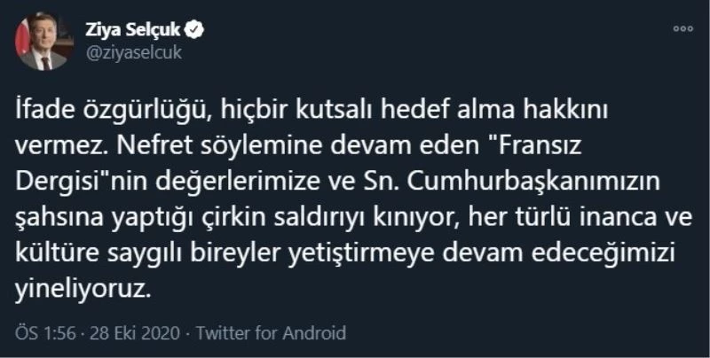 Milli Eğitim Bakanı Ziya Selçuk, Fransız dergisinin Cumhurbaşkanı Recep Tayyip Erdoğan’ı hedef alan ahlaksız karikatürünü kınadığını ifade etti.