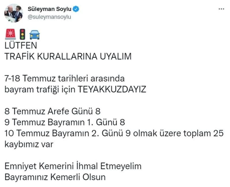 “Lütfen trafik kurallarına uyalım. 7-18 Temmuz tarihleri arasında bayram trafiği için teyakkuzdayız. 8 Temmuz arefe günü 8, 9 Temmuz bayramın 1. günü 8, 10 Temmuz bayramın 2. günü 9 olmak üzere toplam 25 kaybımız var. Emniyet kemerini ihmal etmeyelim. bayramınız kemerli olsun.”