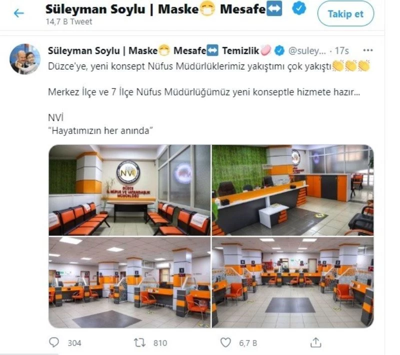 İçişleri Bakanı Süleyman Soylu, sosyal medya hesabında yeni konsept ile hizmete hazır hale getirilen Düzce Nüfus Müdürlüğünün görsellerini paylaştı. Bakan Soylu, paylaşıma “Düzce’ye yeni konsept Nüfus Müdürlüklerimiz yakıştı mı, çok yakıştı. Merkez ilçe ve 7 ilçe Nüfus Müdürlüğümüz yeni konseptle hizmete hazır” notunu düştü.