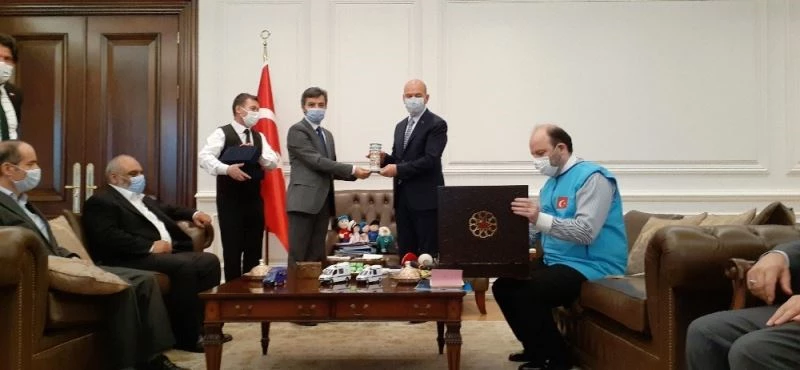 Kabul sonunda Bakan Soylu’ya yardım kuruluşları temsilcileri sırasıyla hediye taktim etti.