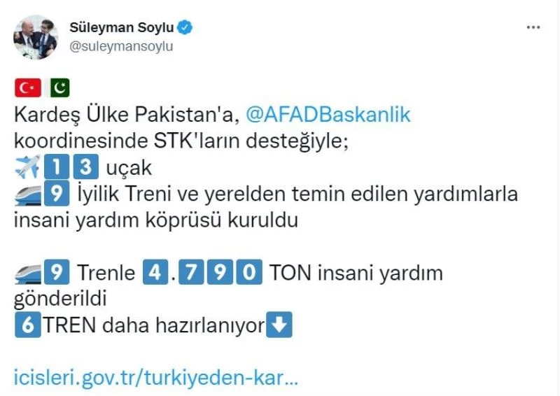 İçişleri Bakanı Süleyman Soylu, sel felaketinin yaşandığı Pakistan’a AFAD koordinesinde STK’ların desteğiyle 13 uçak ve 9 İyilik Treni ile yardım gönderildiğini belirterek, 6 trenin daha hazırlandığını söyledi.