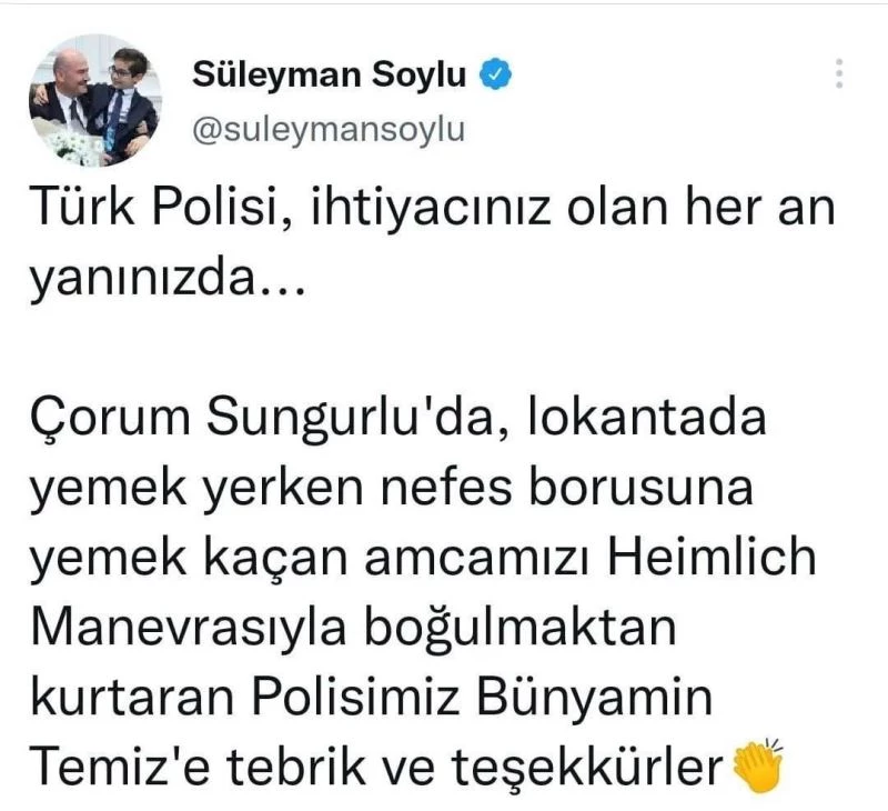 Sosyal medya hesabından açıklama yapan Bakan Soylu, paylaşımında; "Türk Polisi, ihtiyacınız olan her an yanınızda. Çorum Sungurlu’da, lokantada yemek yerken nefes borusuna yemek kaçan amcamızı Heimlich Manevrasıyla boğulmaktan kurtaran Polisimiz Bünyamin Temiz’e tebrik ve teşekkürler" ifadelerine yer verdi.