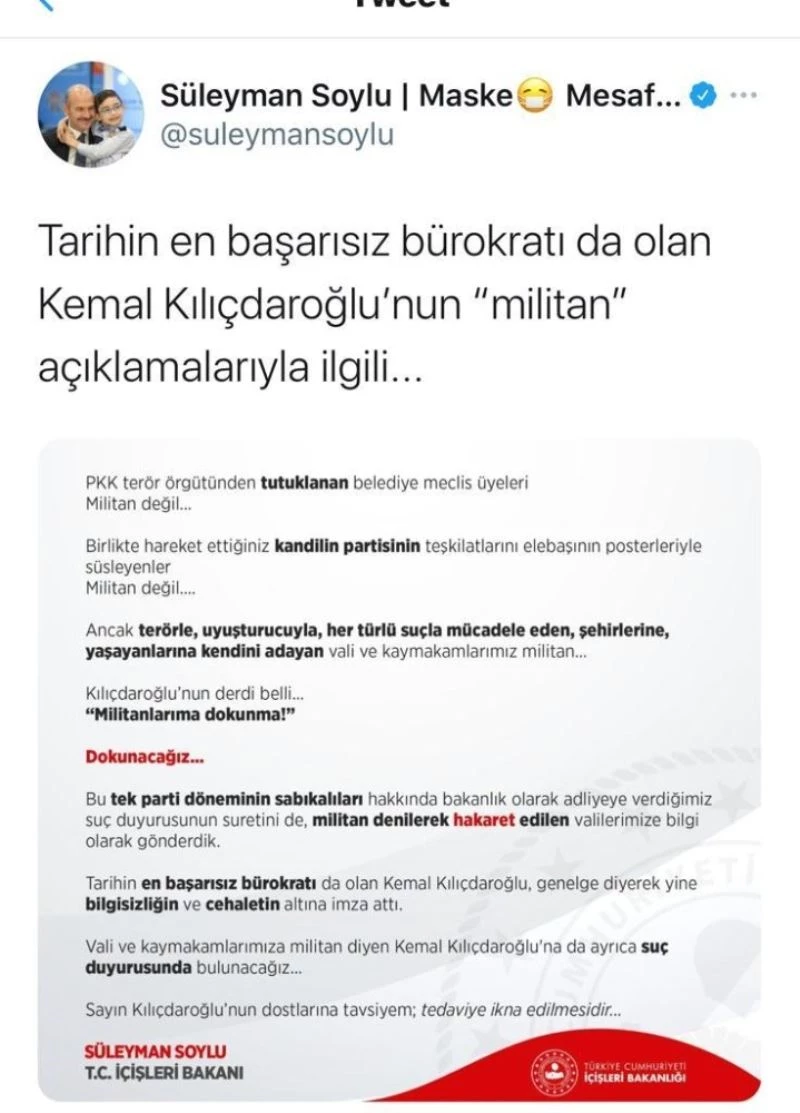 “PKK terör örgütünden tutuklanan belediye meclis üyeleri militan değil, birlikte hareket ettiğiniz Kandil’in partisinin teşkilatlarını elebaşının posterleriyle süsleyenler militan değil, ancak terörle, uyuşturucuyla, her türlü suçla mücadele eden, şehirlerine, yaşayanlarına kendini adayan vali ve kaymakamlarımız militan. Kılıçdaroğlu’nun derdi belli, ’Militanlarıma dokunma.’ Dokunacağız. Bu tek parti döneminin sabıkalıları hakkında Bakanlık olarak adliyeye verdiğimiz suç duyurusunun suretini de, ’militan’ denilerek hakaret edilen valilerimize bilgi olarak gönderdik. Tarihin en başarısız bürokratı da olan Kemal Kılıçdaroğlu, ’genelge’ diyerek yine bilgisizliğin ve cehaletin altına imza attı. Vali ve kaymakamlarımıza ’militan’ diyen Kemal Kılıçdaroğlu’na da ayrıca suç duyurusunda bulunacağız. Sayın Kılıçdaroğlu’nun dostlarına tavsiyem; tedaviye ikna edilmesidir.”