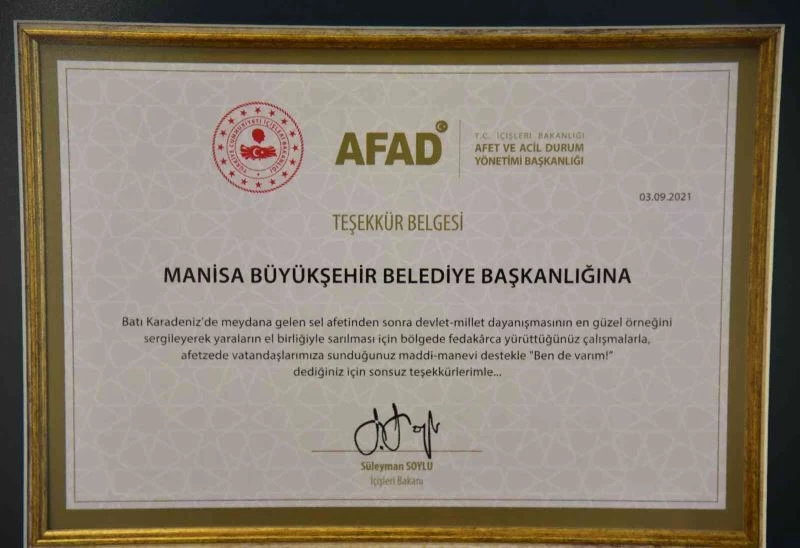 Batı Karadeniz bölgesinde meydana gelen sel felaketi sonrasında bölgedeki çalışmalara verdiği destekler nedeniyle, İçişleri Bakanı Süleyman Soylu tarafından Manisa Büyükşehir Belediyesine teşekkür belgesi gönderildi.