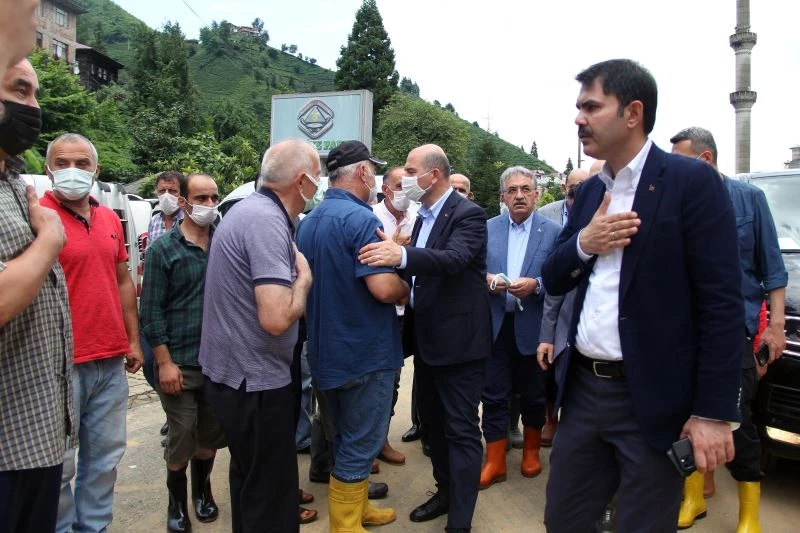 Rize’de dün öğleden sonra etkili olan sağanak yağışın ardından meydana gelen sel ve heyelan nedeniyle zarar gören bölgelerde inceleme yapmak için İçişleri Bakanı Süleyman Soylu, Çevre ve Şehircilik Bakanı Murat Kurum ve Ulaştırma ve Altyapı Bakanı Adil Karaismailoğlu incelemelerde bulundu.