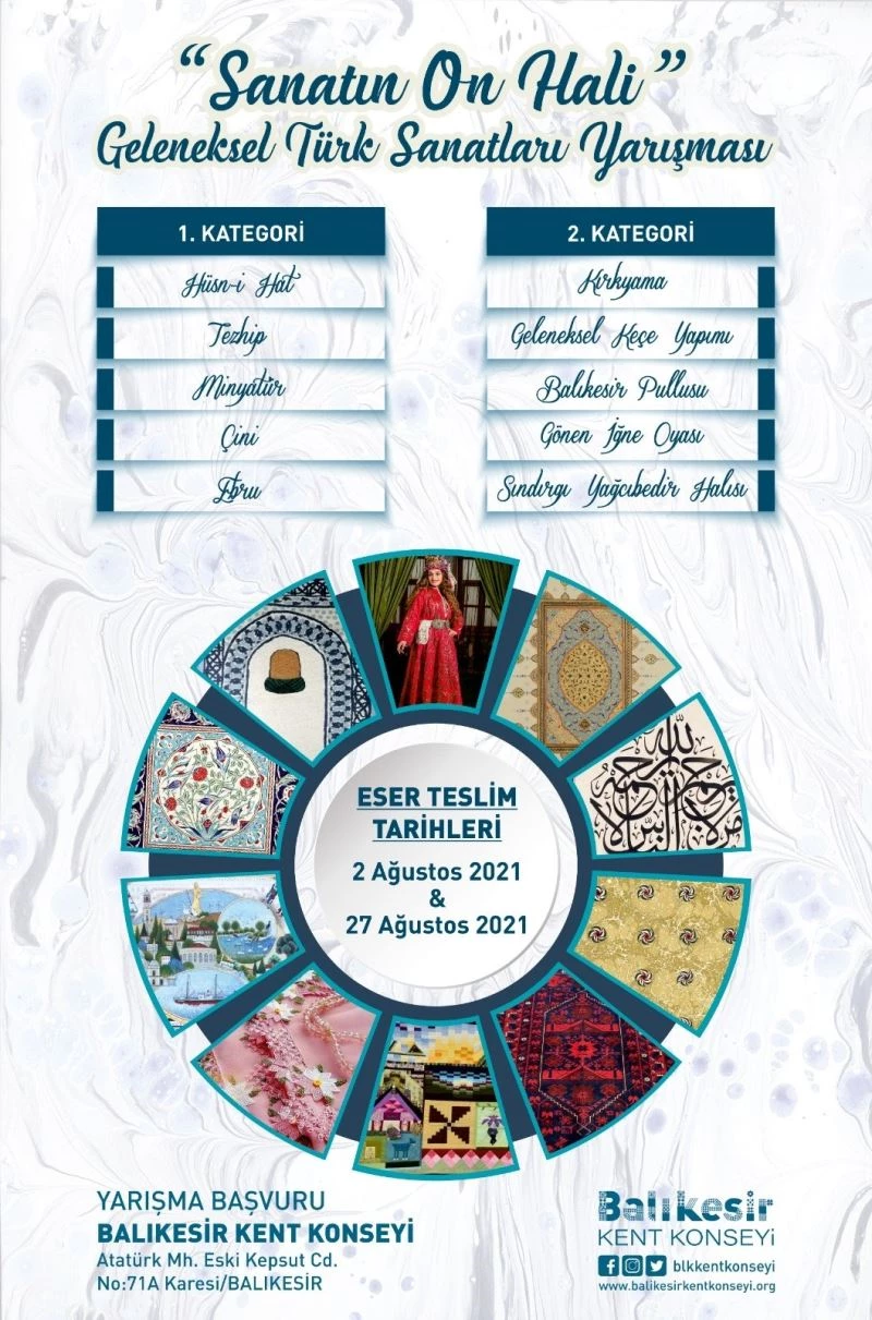 Balıkesir Büyükşehir Belediyesi ile Balıkesir Kent Konseyi işbirliği içerisinde; geleneksel sanatların gelişimine ve tanıtılmasına katkı sağlamak, sanat bilincini yaygınlaştırarak üretimini desteklemek, tarih boyunca önemli medeniyetlere ev sahipliği yapmış şehrimizin zengin tarihi ve kültürel mirasını ortaya çıkarmak amacıyla “Sanatın On Hali-Geleneksel Türk Sanatları Yarışması” düzenleniyor.