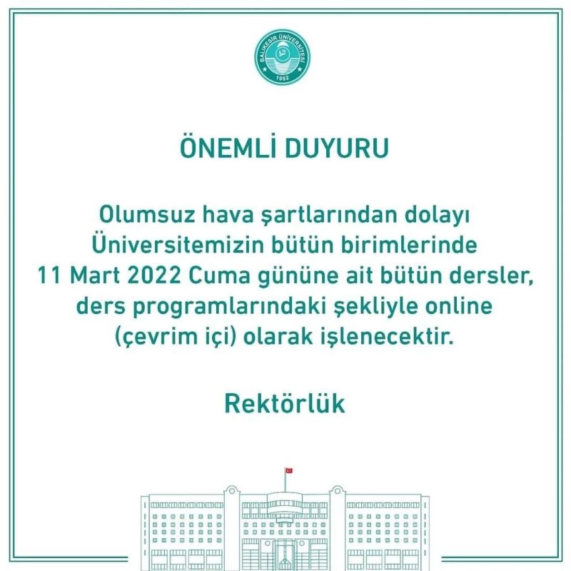 Balıkesir Üniversitesi Rektörlüğünden yapılan açıklama, "Olumsuz hava şartları dolayı üniversitemizin bütün birimlerinde 11 Mart 2022 Cuma gününe ait bütün dersler, ders programlarındaki şekliyle online (çevrim içi) olarak işlenecektir" denildi.