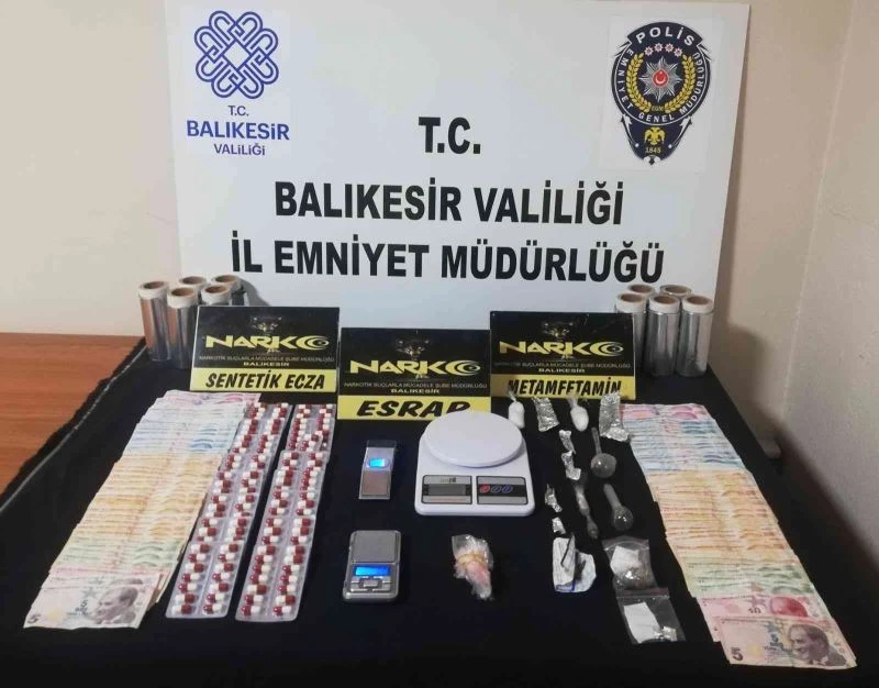 Balıkesir İl Emniyet Müdürlüğü Narkotik Suçlarla Mücadele Şube Müdürlüğü görevlilerince uyuşturucu madde ticaretini, kullanımını ve sokak satıcılarının faaliyetlerini önlemeye yönelik olarak İl Merkezinde yapılan 7 ayrı çalışmada, 19 şüpheli şahıs yakalanırken, mevcutlu olarak adli makamlara sevk edilen 7 şahıstan 4’ü tutuklanıp 3’ü adli kontrol kararıyla serbest bırakıldı. 12 şahıs ise haklarında yapılan adli işlemler neticesi serbest bırakıldı. Olaylarla ilgili yapılan aramalarda; 40,50 gram metamfetamin maddesi, 4.36 gram afyon macunu, 1,67 gram esrar maddesi, 342 adet sentetik ecza hap, 3 adet hassas terazi, 51 adet uyuşturucu madde paketlemede kullanılan kilitli poşet, 11 adet rulo halinde alüminyum folyo, 3 adet uyuşturucu madde kullanmaya yarayan cam aparat, Uyuşturucu/uyarıcı madde ticaretinden elde edildiği değerlendirilen 7 bin 905 TL ele geçirildi.