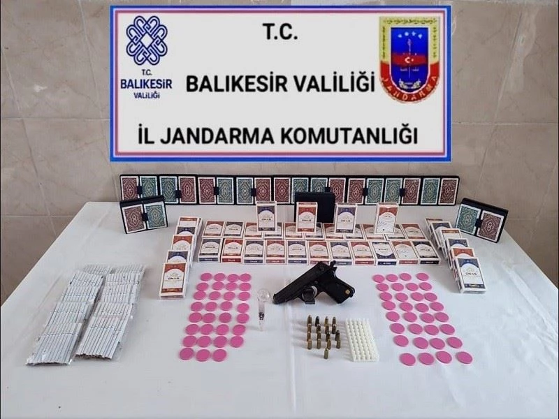 Balıkesir İl Jandarma Komutanlığı ekipleri; Savaştepe ilçesinde uyuşturucu madde bulundurduğu tespit edilen 2 şüphelinin ikametinde yaptığı aramada 1 adet uyuşturucu kullanma aparatı, 200 adet makaron, 62 paket iskambil kağıdı, 63 adet oyun pulu, 1 adet tabanca ve 17 adet tabanca fişeği ele geçirdi.