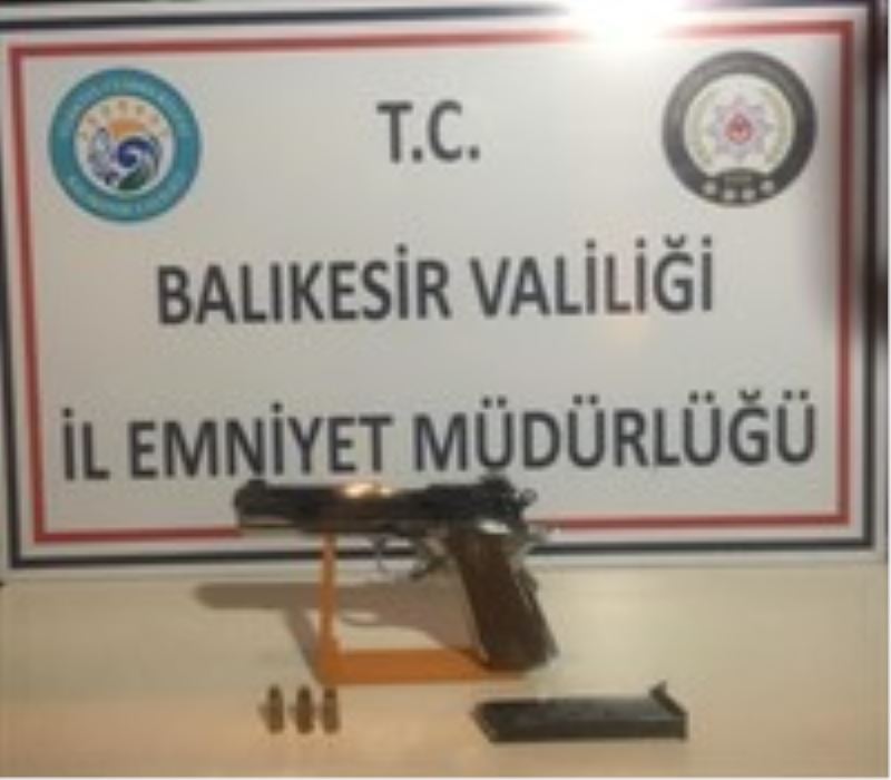 Balıkesir İl Emniyet Müdürlüğü ekiplerince il genelinde yapılan çalışmalarda il merkezinde 1 adet Zoraki marka 9 mm çapında kurusıkı tabanca ve buna ait 43 adet fişek, Ayvalık ilçesinde, 1 adet Walter marka 9 mm çapında ruhsatsız tabanca ve 1 adet Glock marka 9 mm çapında ruhsatsız tabanca ve 11 adet fişek olmak üzere toplam 2 adet ruhsatsız tabanca, 1 adet kurusıkı diye tabir edilen tabanca, 67 adet fişek ele geçirildi.