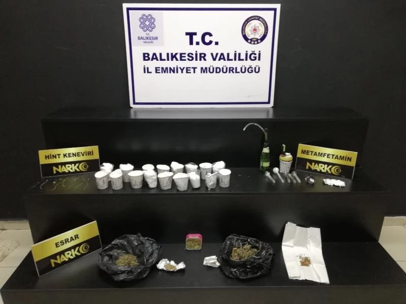 Narkotik Suçlarla Mücadele Şube Müdürlüğü görevlilerince ilimizde uyuşturucu madde ticaretini, kullanımını ve sokak satıcılarının faaliyetlerini önlemeye yönelik olarak 14/11/2021 tarihinde İl Merkezi, Ayvalık, Bigadiç, Edremit, Gömeç, Havran ve Susurluk ilçelerinde yapılan 23 ayrı çalışmada, 40 şahıs gözaltına alınırken, adli makamlara sevk edilen 5 şahıs adli kontrol kararı ile diğer 35 şahıs ise haklarında yapılan adli işlemler neticesi serbest bırakıldı. Olaylarla ilgili yapılan aramalarda; 31,99 gram metamfetamin, 127,82 gram esrar, 64,92 gram bonzai maddesi, 426 adet sentetik ecza hap, 8 kök hint keneviri bitkisi, 12 extasy hap, Bir adet tütünle karışık esrarlı sigara, 10 adet uyuşturucu madde içiminde kullanılan payp aparat ele geçirildi.