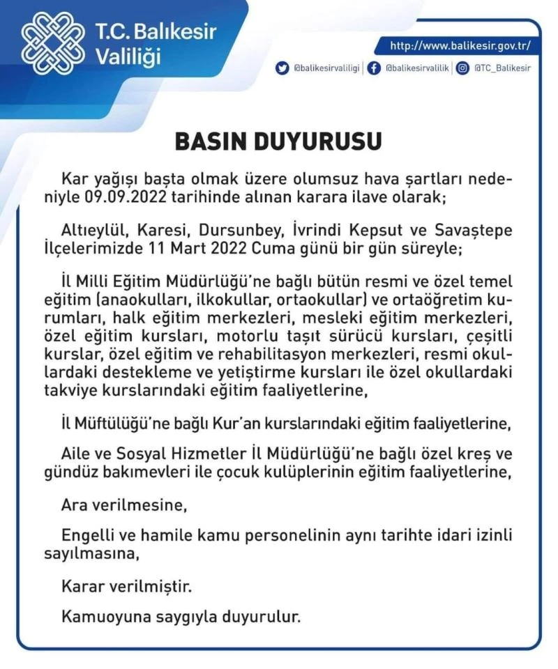 Balıkesir Valiliğinden açıklamada, "Kar yağışı başta olmak üzere olumsuz hava şartları nedeniyle 9 Mart 2022 tarihinde alınan karara ilave olarak; Altıeylül, Karesi, Dursunbey, İvrindi, Kepsut ve Savaştepe ilçelerimizde 11 Mart 2022 Cuma günü bir gün süreyle; İl Milli Eğitim Müdürlüğü’ne bağlı bütün resmi ve temel eğitim (anaokulları, ilkokulları, ortaokullar) ve ortaöğretim kurumları, halk eğitim merkezleri, mesleki eğitim merkezleri, özel eğitim kursları, motorlu taşıt sürücü kursları, çeşitli kurslar, özel eğitim ve rehabilitasyon merkezleri, resmi okullardaki destekleme ve yetiştirme kursları ile özel okullardaki takviye kurslarındaki eğitim faaliyetlerine, İl Müftülüğü’ne bağlı Kur’an kurslarındaki eğitim faaliyetlerine, Aile ve Sosyal Hizmetler İl Müdürlüğü’ne bağlı özel kreş ve gündüz bakımevleri ile çocuk kulüplerinin eğitim faaliyetlerine, ara verilmesine, Engelli ve hamile kamu personellerinin aynı tarihte idari izinli sayılmasına karar verilmiştir" denildi.