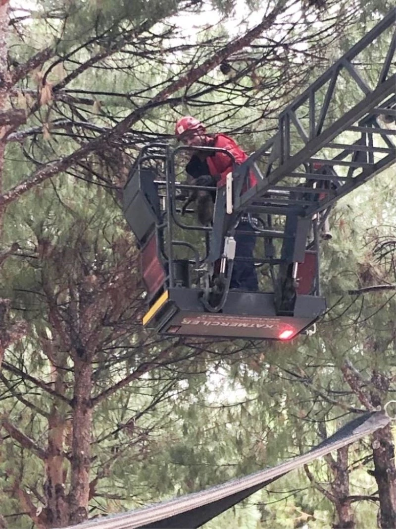 Balıkesir Burhaniye ilçesinde, çam ağacının üzerinde mahsur kalan kediyi itfaiye kurtardı.