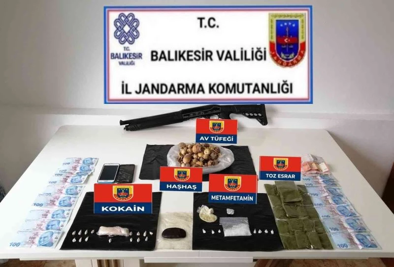 Jandarma Komutanlığı ekipleri uyuşturucu madde imal ve ticaretine yönelik yapılan çalışmalar neticesinde, Altıeylül ilçesinde uyuşturucu madde ticareti ve torbacılık yaptığı tespit edilen 1 şüphelinin ikamet adresinde arama yaptı. Yapılan aramada 110 gram kokain, 100 gram afyon sakızı, 60 gram metamfetamin, 270 gram toz esrar, 1 adet av tüfeği, 2 adet cep telefonu ve suçtan elde edilen 2 bin TL ele geçirildi. Olayla ilgili 1 şüpheli gözaltına alındı.