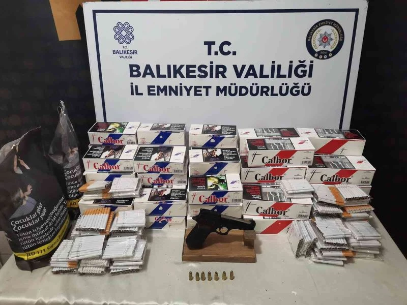 Edinilen bilgiye göre, Balıkesir İl Emniyet Müdürlüğü Kaçakçılık ve Organize Suçlarla Mücadele Şube Müdürlüğü Bandırma Kaçakçılık ve Organize Suçlarla Mücadele Grup Amirliği görevlilerince “Tütün ve Tütün Mamülü Kaçakçılığının” önlenmesine yönelik Bandırma ilçesinde yürütülen çalışmalar kapsamında; önceki gün bir işyerine yapılan operasyonda; 11 bin 580 adet dolu makaron, bir adet 9 milimetre çaplı ruhsatsız tabanca ve şarjörü, 7 adet fişek ele geçirildi. Operasyonda bir şüpheli gözaltına alınırken, bu kişi hakkında yasal işlem başlatıldı.