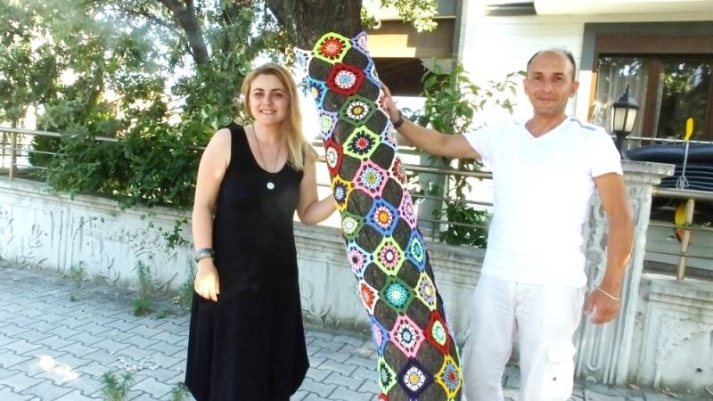 Balıkesir Burhaniye ilçesi Ören Mahallesi’nde oturan Kaan Tuna ve Dilek Tuna çifti, 2 yıl önce edindikleri evlerinin bahçesini çiçek ve ağaçlarla süslerken, bir meşe ağacı ile badem ağacının gövdesini de motiflerle süsledi. Gelin gibi süslenen ağaçlar da ilgi odağı oldu. Yoldan gelip geçen vatandaşlar süslenen ağaçlara tekrar tekrar bakarken, bazıları da hatıra fotoğrafı çektiriyor. Eve iki yıl önce taşındıklarını anlatan 2 çocuk annesi ev hanımı Dilek Tuna, “İki yıl önce bu eve geldik. Bahçemizi renklendirmek istedim. Motif yapmayı da çok seviyorum. Motiflerle ağaçları renklendirmek istedim. Ortaya da bu çıktı. Dışarıdaki ağacı da, kendime şal diye başlayıp sonra vazgeçtiğim motifleri de ağacı renklendirmek için kullandım. İnsanların ilgisini çekiyor. Resim çektiriyorlar. Bizim de hoşumuza gidiyor” dedi.