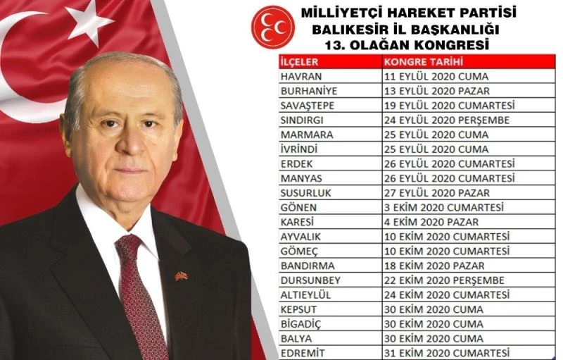 MHP Balıkesir İl Başkanlığından yapılan açıklamada 11 Eylül’de Havran ilçe kongresi ile başlayacak ve 31 Ekim’de Edremit ilçe kongresi ile bitecek. MHP Balıkesir İl Başkanlığından yapılan açıklamada 11 Eylül Havran İlçe kongresi, 13 Eylül Burhaniye, 19 Eylül Savaştepe, 24 Eylül, Sındırgı, 25 Eylül İvrindi ve Marmara, 26 Eylül Erdek ve Manyas, 27 Eylül Susurluk, 3 Ekim Gönen, 4 Ekim Karesi, 10 Ekim Ayvalık ve Gömeç, 18 Ekim Bandırma, 22 Ekim Dursunbey, 24 Ekim Altıeylül, 30 Balya, Kepsut ve Bigadiç ve 31 Ekim Edremit ilçe kongreleri yapılacağı açıklandı.