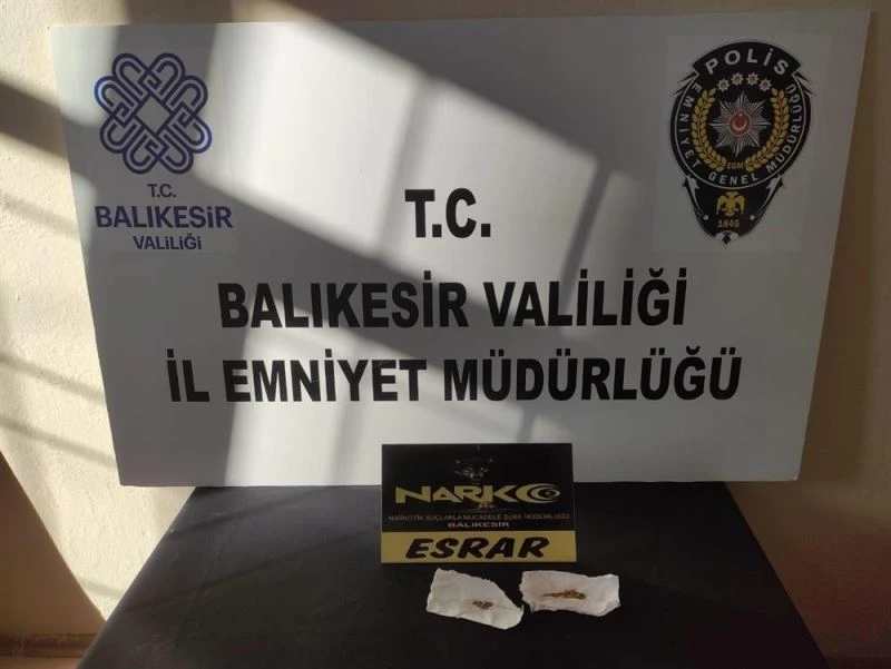 Balıkesir İl Emniyet Müdürlüğü Narkotik Suçlarla Mücadele Şube Müdürlüğü ekiplerince uyuşturucu madde ticareti ve kullanımını önlemeye yönelik olarak 11 ayrı çalışmada Balıkesir İl merkezi, Bandırma, Burhaniye, Gönen, Sındırgı ve Havran İlçelerinde 15 şüpheli şahsı yakaladı ve şahıslar haklarında yapılan adli işlemler neticesi serbest bırakıldı. Olaylarla ilgili yapılan aramalarda; 1,31 gram eroin, 167 adet sentetik ecza hap, 37,45 gram esrar, 16,84 gram metamfetamin ve 1 adet uyuşturucu madde içiminde kullanılan payp tabir edilen aparat ele geçirildi.