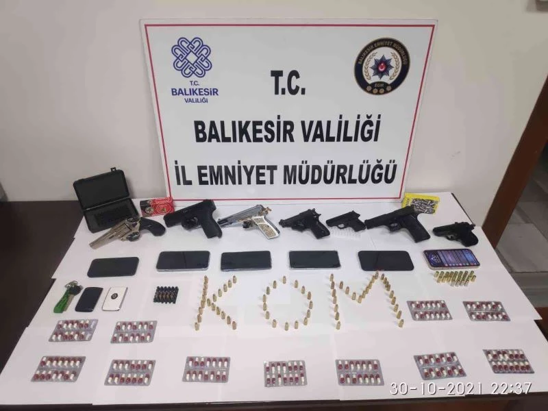 Balıkesir İl Emniyet Müdürlüğü Kaçakçılık ve Organize Suçlarla Mücadele Şube Müdürlüğü görevlilerince il merkezinde yürütülen çalışmalar kapsamında 5 şahsın işyeri ve ikametlerinde yapılan kontrollerde 3 adet ruhsatsız tabanca 4 adet kuru sıkı tabanca 152 adet sentetik ecza hapı 59 adet tabanca fişeği 30 adet kuru sıkı fişeği ele geçirildi. Konu ile ilgili 5 şüpheli şahıs yakalanarak gözaltına alındı.