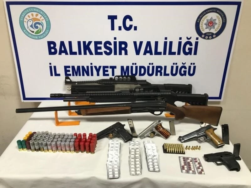 Altıeylül’ün Gümüşçeşme Mahallesi’nde, ikamet ve iş yerinde ruhsatsız ateşli silah bulunduğu ve bu silahların çeşitli olaylarda kullanıldığı, yine bu şahısların uyuşturucu madde ticareti yaptığı bilgisi üzerine haklarında çeşitli suçları bulunan 13 şüphelinin Gümüşçeşme Mahallesi pazar yeri civarındaki 10 adresine yönelik Asayiş Şube Müdürlüğü, KOM Şube Müdürlüğü ve Narkotik Şube Müdürlüğünden toplam 24 ekip 70 personel, Özel Harekat Şube Müdürlüğünden 1 tim, Çevik Kuvvet Şube Müdürlüğünden 2 tim ile birlikte şafak operasyonu gerçekleştirildi. Yapılan ikamet aramalarında; 3 adet ruhsatsız tabanca, 3 adet ruhsatsız av tüfeği, 2 adet kuru sıkı tabanca, 6 adet 7.65 mm çapında mermi, 69 adet av tüfeği fişeği, 129 adet kuru sıkı mermisi ve 177 adet uyuşturucu nitelikli hap ele geçirildiği açıklandı.