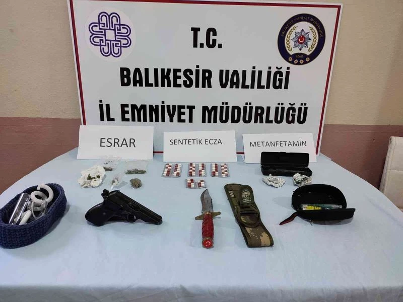 Balıkesir İl Emniyet Müdürlüğü Narkotik Suçlarla Mücadele Şube Müdürlüğü ekipleri şehir genelinde uyuşturucu madde ticareti yapan ve kullanan şahıslara yönelik yürütülen çalışmalarda; şüphe üzerine durdurulan bir araçta yapılan aramada; 4 parça halinde 72,08 gram metamfetamin, 1 adet ruhsatsız tabanca, 1 adet kurusıkı tabanca, 12 adet tabanca fişeği, uyuşturucu madde ticaretinden elde edildiği değerlendirilen 8 bin 130 TL para ele geçirildi. Araçta bulunan İ.T. isimli şahıs Uyuşturucu Madde Ticareti Yapmak suçundan gözaltına alınırken, yaşı küçük suça sürüklenen çocuk U.E.C. isimli şahıs hakkında işlem yapılmak üzere Çocuk Şube Müdürlüğüne teslim edildi.