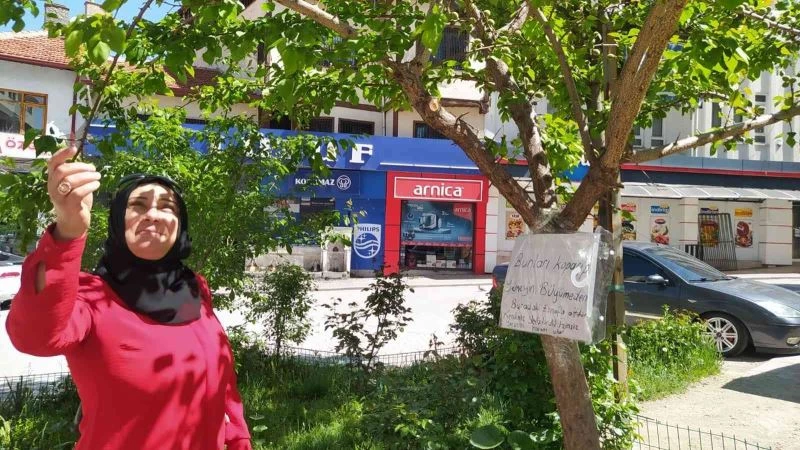 Kütahya’nın Balıklı Caddesi esnafları, yeşil alandaki iki meyve ağacının ürünlerinin olgunlaşmadan koparılmamasını istiyor.