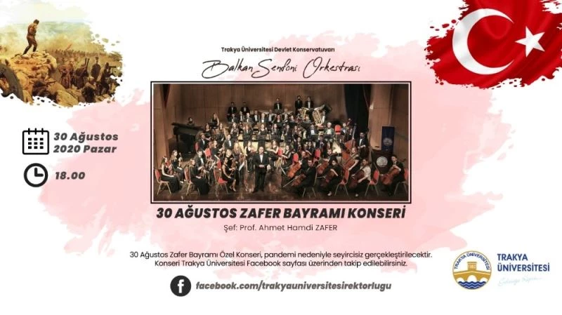 Bölgenin en büyük senfoni orkestrası olan Trakya Üniversitesi Balkan Senfoni Orkestrası, 30 Ağustos 1922’de Dumlupınar’da Mustafa Kemal Atatürk’ün başkumandanlığında zaferle sonuçlanan Büyük Taarruz’un 98. yıl dönümünde özel bir konser düzenleyecek. Covid-19 önlemleri kapsamında seyircisiz olarak gerçekleştirilecek olan ve Trakya Üniversitesinin sosyal medya hesapları üzerinden yayınlanacak konserde büyük zaferin coşkusu sanatla kutlanacak.