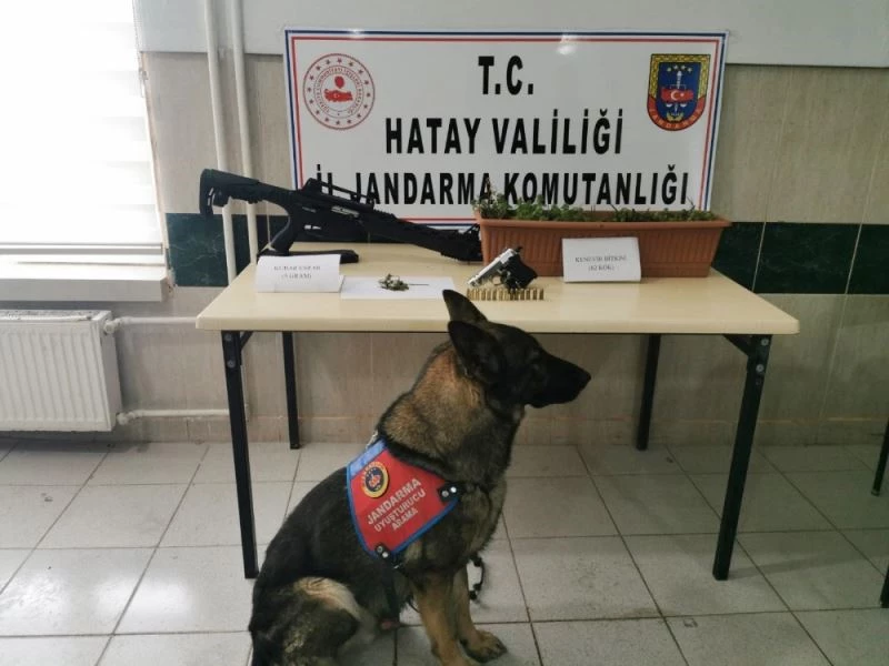 İlçe Jandarma Komutanlığı, KOM Şube Müdürlüğü, Jandarma Suç Araştırma Timi ve Öğle isimli narkotik madde arama köpeği ile birlikte şüpheli şahsın evinde yapılan aramada, 5 gram kubar esrar, evin balkonunda bulunan saksılara ekilmiş 82 kök kenevir bitkisi, 1 adet ruhsatsız otomatik av tüfeği ve 1 adet 9 mm çapında ruhsatsız tabanca ve tabancaya ait 14 adet fişek ve ele geçirildi.