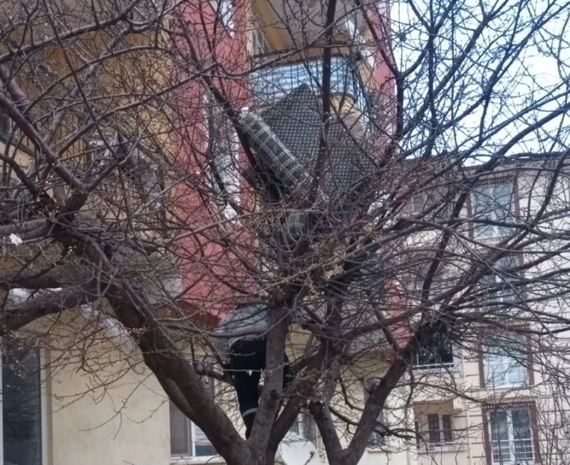 Balkondan aşağı attığı eski koltuk ağaçta takılı kalınca belediye ekiplerinden yardım istedi