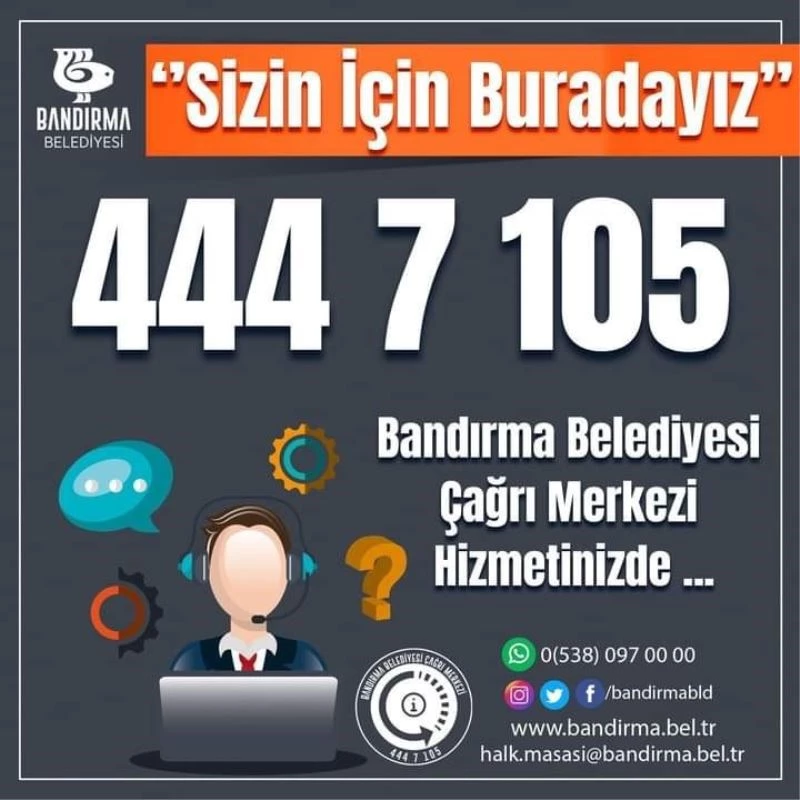 Bandırma’da vatandaşlara büyük kolaylık sağlayacak Çağrı merkezi hizmete girdi. Belediye yetkilileri tarafından verilen bilgide, " Şehrimiz genelinde 360 derece iletişim ağını oluşturmak ve hemşehrilerimizden gelen talepleri tek bir kanaldan yönetmek adına Çağrı Merkezi birimimizi faaliyete geçiriyoruz. Siz değerli vatandaşlarımızdan gerek telefon, gerek dijital, gerekse resmi kanallar aracılığıyla gelecek olan talepler/öneriler/şikayetler çağrı merkezi birimimiz tarafından hızlı şekilde kayıt altına alınıp çözüme kavuşturulacak ve geri dönüş sağlanacaktır. Bugünden tarihinden itibaren 444 7 105 numaralı telefondan Çağrı Merkezi’mize ulaşabilir, başvurularınızı anında gerçekleştirebilirsiniz. Unutmadan hatırlatalım "Sizin İçin Buradayız" " denildi.