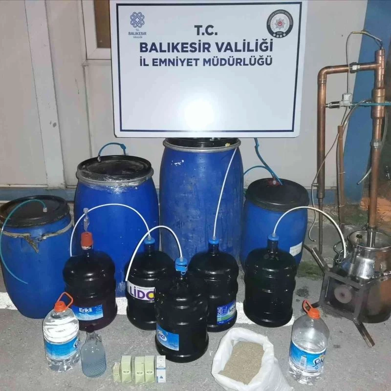 Balıkesir İl Emniyet Müdürlüğü Kaçakçılık ve Organize Suçlarla Mücadele Şube Müdürlüğü Bandırma Kaçakçılık ve Organize Suçlarla Mücadele Grup Amirliği görevlilerince yürütülen çalışmalar çerçevesinde 19.10.2021 tarihinde Bandırma ilçesinde şüpheli bir şahsın ikametine baskın yapıldı. 180 litre mayalanmaya bırakılmış içki, 95 litre sahte şarap, 9 litre etil alkol, 2 litre sahte rakı, 2 kg anason bitkisi, 5 şişe içki aroması, 1 imbik ele geçirildi. Şüpheli şahıs yakalanarak gözaltına alındı.