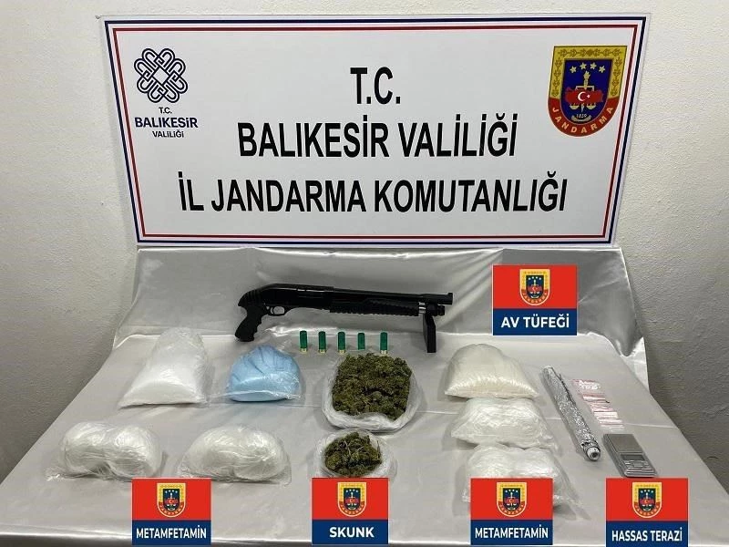 Balıkesir’in Bandırma ilçesinde, Balıkesir İl Jandarma Komutanlığınca, uyuşturucu madde imal ve ticaretine yönelik yapılan istihbari çalışmalar neticesinde Bandırma’da uyuşturucu madde ticareti yaptığı tespit edilen 6 şüpheliye ait ikamet adresinde yapılan aramada; 5.565 gram metamfetamin, 1 kilogram gram skunk, 1 adet hassas terazi, 1 adet alüminyum folyo, 70 adet kilitli poşet, 3 adet cep telefonu ve 1 adet av tüfeği ele geçirildi. Olay karışan 6 şüpheli yakalanarak gözaltına alındı. Emniyet, asayiş ve kamu düzeninin sağlanmasına yönelik çalışmalara aralıksız olarak devam edeceğini belirtti.